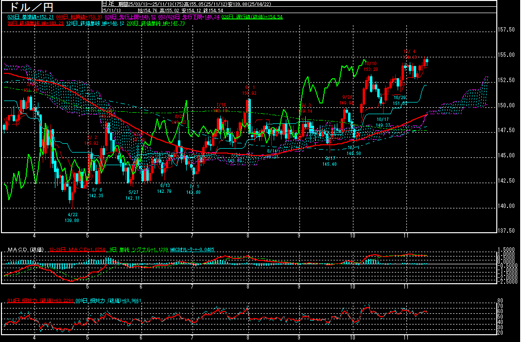 米政府機関の一部閉鎖が解除される見通しとなり、米景気への下押し圧力が和らぐとの見方から投資家のリスク選好姿勢が強まり、円売りドル買いの動きが拡大。週明け10日に154円台を回復し、12日に2月4日以来の155円台に乗せる場面もみられております。
