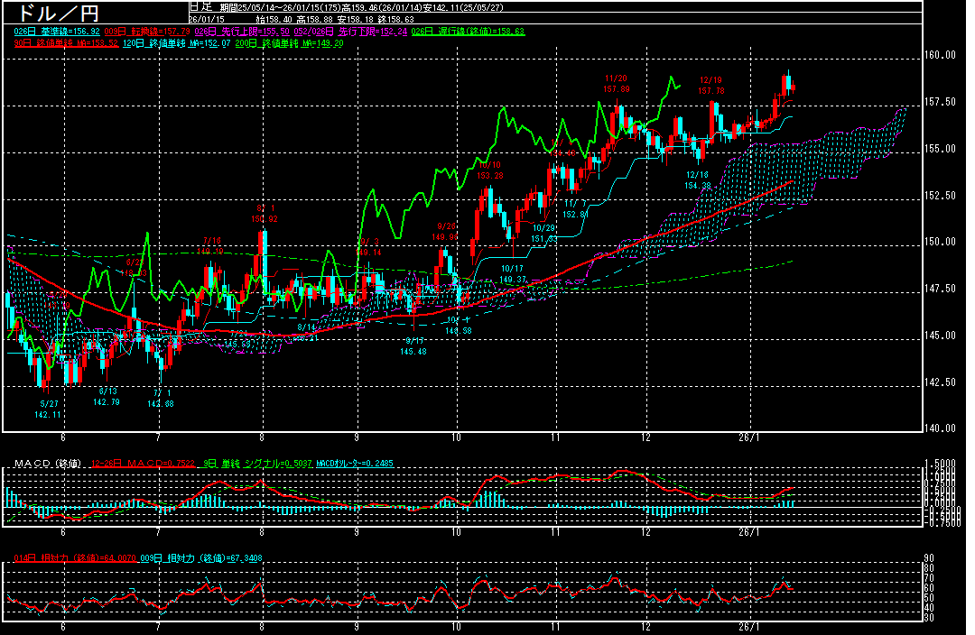 その後も、与党が議席数を増やし高市首相が掲げる積極財政を推し進めれば、日本の財政が悪化するとの警戒から円売りドル買いが継続。昨年1月10日の158.88円を上抜いて、13日に2024年7月以来1年半ぶりに159円台に乗せております。