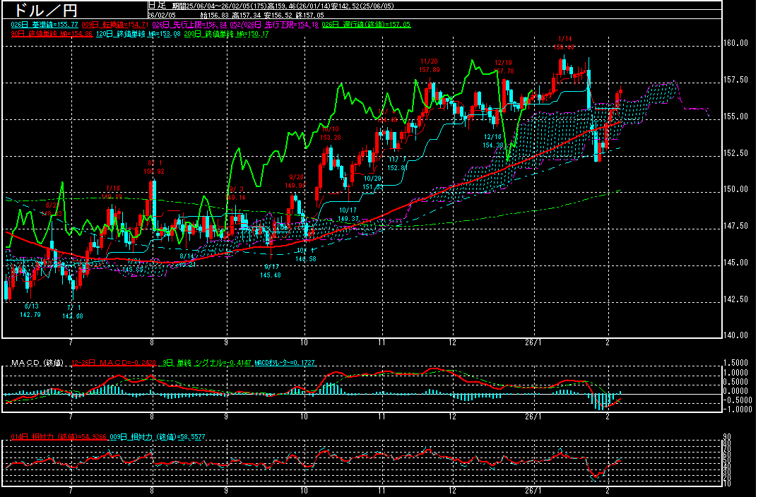 テクニカル的にも、MACDがゴールデン・クロスとなる中、一目均衡表の雲を上抜いただけに、レートチェック観測が高まる直前に付けた159円、次いで2024年7月以来の160円台に乗せることも想定されます。ただ、160円付近では、政府・日銀による円買い介入への警戒感が再燃しそうで、大台達成後は円が買い戻されそうです。