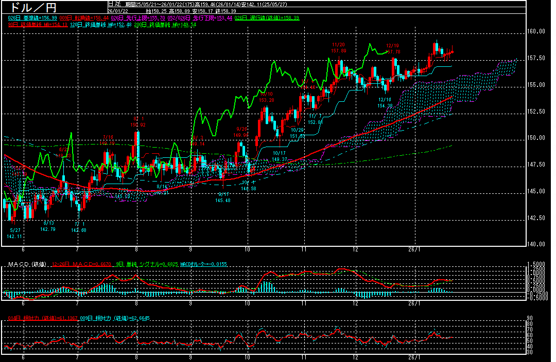 米ドル・円は、1月14日に昨年1月10日の158.88円を上抜いて159.46円まで円安が進むも、政府・日銀による円買い介入への警戒感が強まる中で円安が一服。デンマーク自治領グリーンランドを巡る米欧関係の悪化懸念を受けて投資家のリスクオフ姿勢が強まり、円が買い戻される場面も見られたものの、日本の財政悪化への懸念が根強い中、円買いは続かず。その後、トランプ米大統領が欧州への追加関税を撤回したことを受けて、円売りドル買いの動きが拡がる中、158円台後半まで円安が進んでおります。