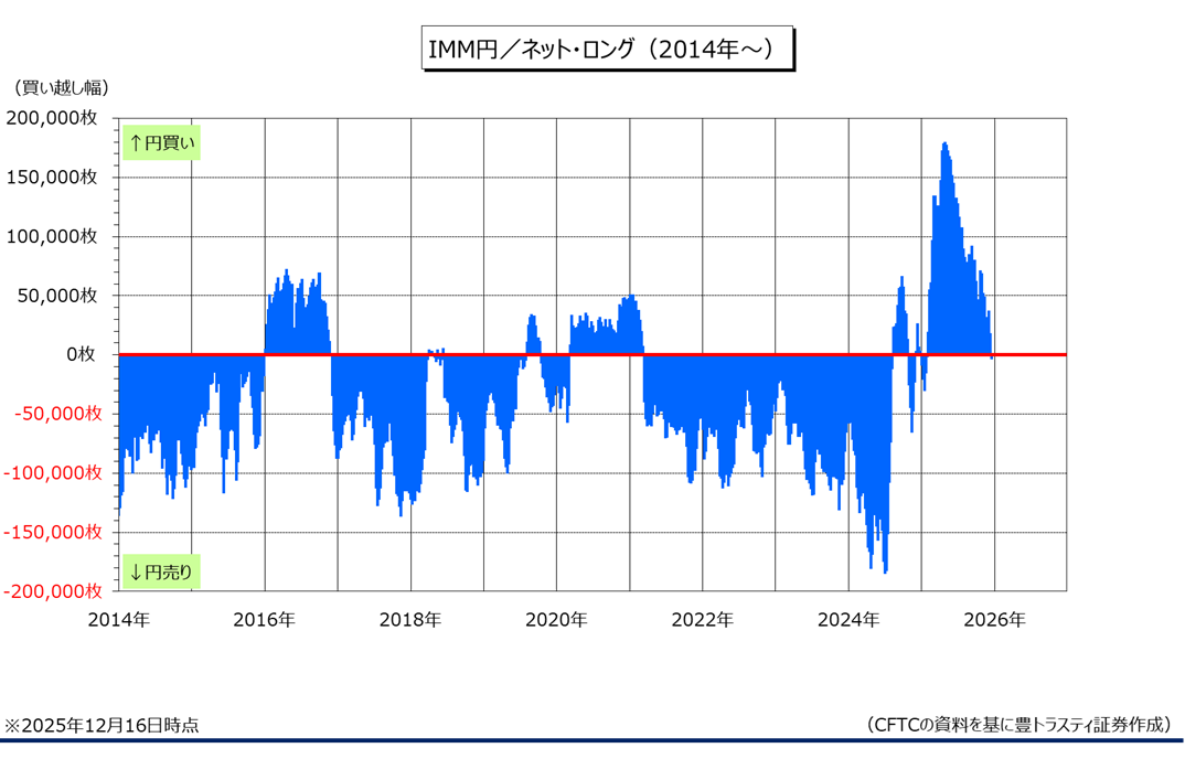 最後に、米商品先物取引委員会(CFTC)のデータによると、大口投機家のIMM通貨(円)のネット・ロングは12月16日時点で前週比2万0390枚減少のマイナス2942枚と、2週連続で減少。ネット・ショートに転じております。