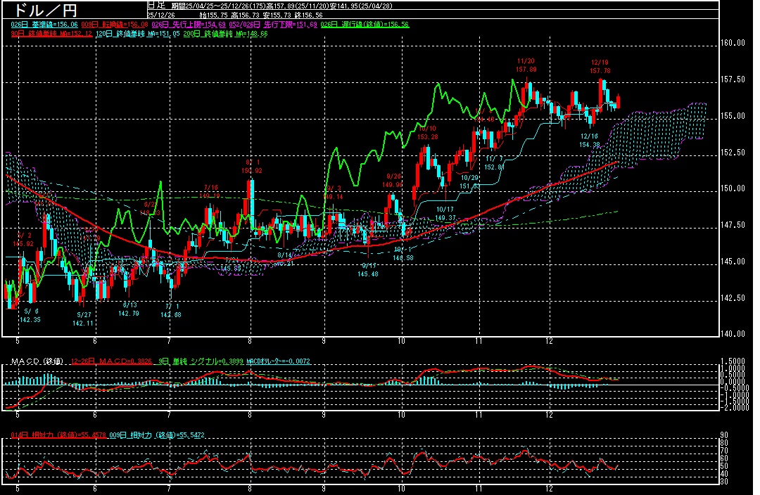 155円台半ばまで円高が進むも、2025年7-9月期米実質GDP(国内総生産)速報値が年率で前期比4.3%増となり、前期(3.8%増)から加速。市場予想(3.2%増)も大幅に上回るなど、米経済の底堅さが示されたため、米長期金利が上昇。日米金利差拡大を意識した円売り・ドル買いの動きが強まり、心理的節目の155円を維持。クリスマス休暇に伴い市場参加者が少なくなる中、その後は155円を中心とした狭いレンジで揉み合う展開に。