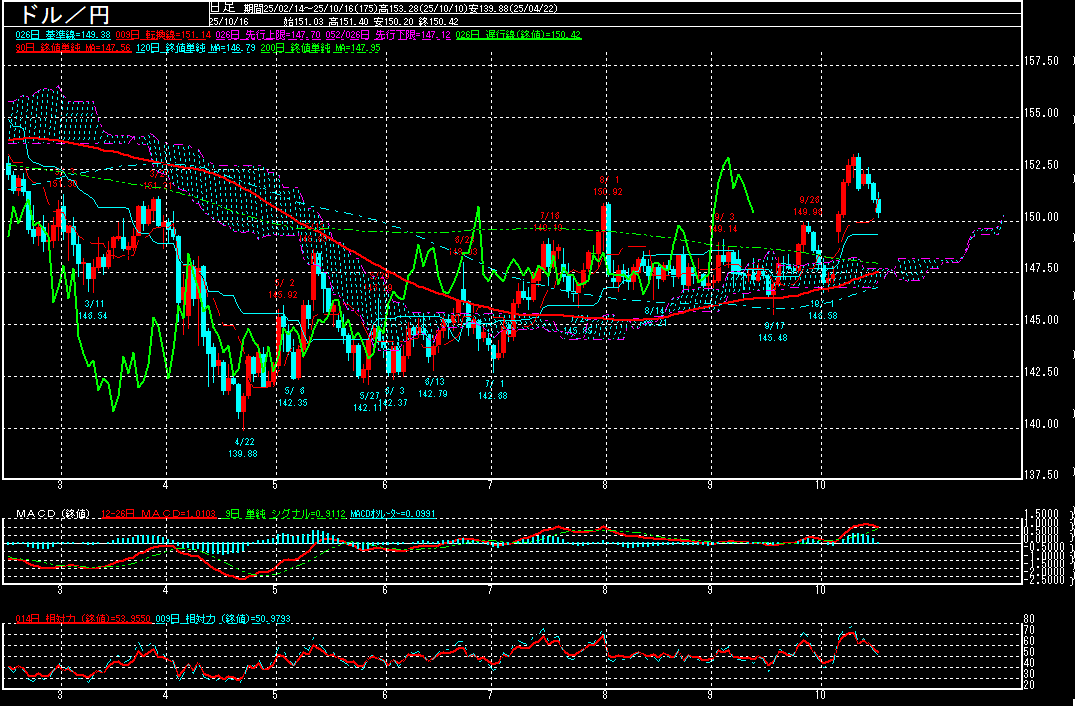 米ドル・円は、10月10日に153.28円まで円安が進む場面もみられるも、公明党が自民党との連立政権から離脱したことで、国内政治を巡る不透明感が強まったことから、円が買い戻される展開に。また、米中貿易摩擦が再燃し、投資家のリスクオフ姿勢が強まったため、相対的な安全通貨として円を選好する動きが拡大。米地銀の信用不安も加わり、16日に150円台前半まで円高が進む場面もみられております。