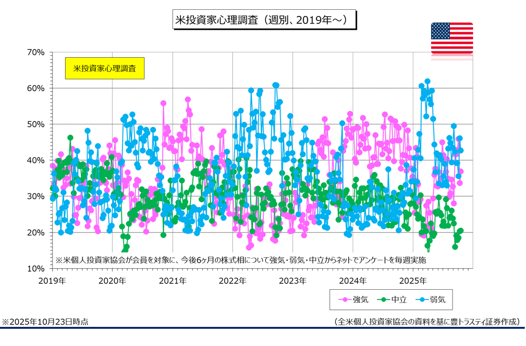米個人投資家協会(AAII)が公表した週報によると、今後6ヶ月の株価見通しに「強気」と答えた割合は10月23日時点で36.9%と、前週比3.2ポイント上昇。一方で、「弱気」と答えた個人投資家の比率は42.7%と、同3.4ポイント低下しました。「中立」は20.5%と、同0.2ポイント上昇。今後6ヶ月の相場見通しに「強気」と答えた割合から「弱気」を引いた値はマイナス5.8ポイント、その週平均はマイナス0.3ポイントとなっております。