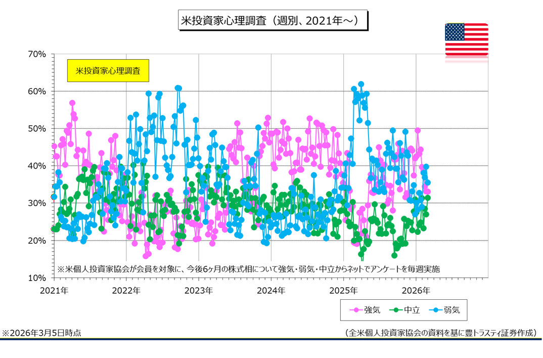 米個人投資家協会(AAII)が公表した週報によると、今後6ヶ月の株価見通しに「強気」と答えた割合は3月5日時点で33.1%と、前週比0.1ポイント低下。5週連続で低下しております。