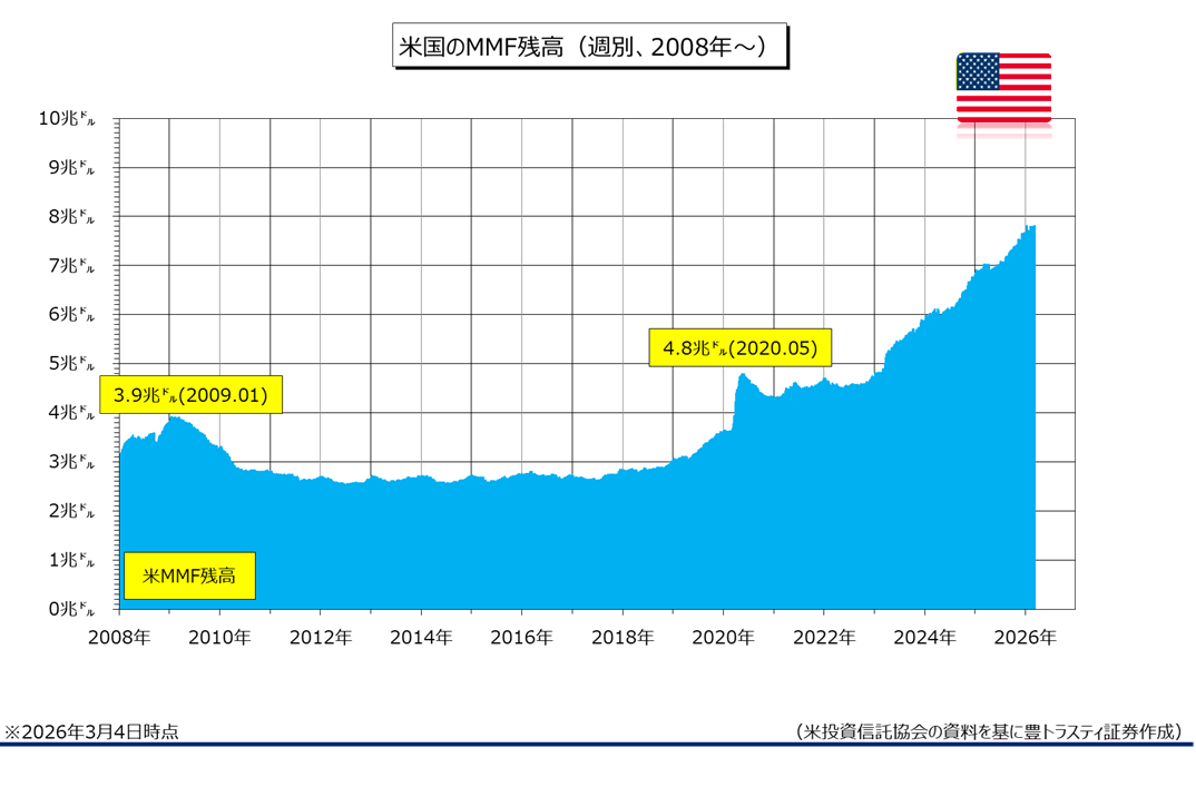 米投資信託協会(ICI)によると3月4日時点の米マネー・マーケット・ファンド(MMF)全体の純資産残高は前週比201.10億ドル増加の7兆8168億ドルと、3週連続で増加。