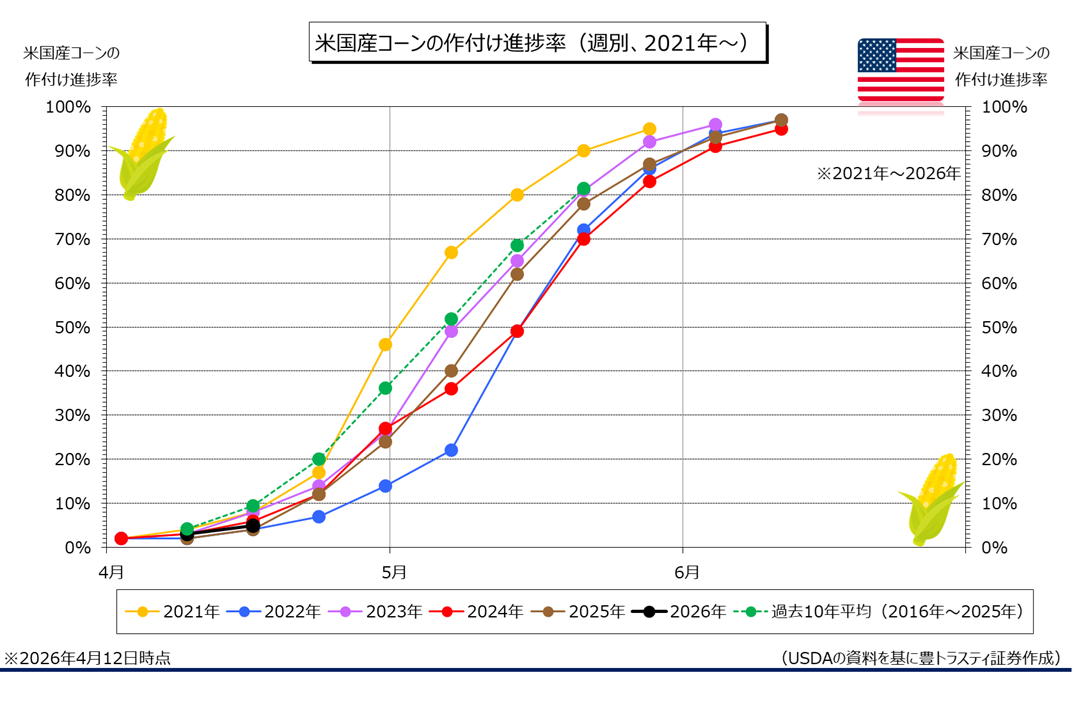 米農務省(USDA)が発表したクロップ・プログレス(4月12日時点)によると、米国産コーンの「作付進捗率」は前週比2ポイント上昇の5%で、前年同期(4%)、過去5年平均(4%)を上回りました。