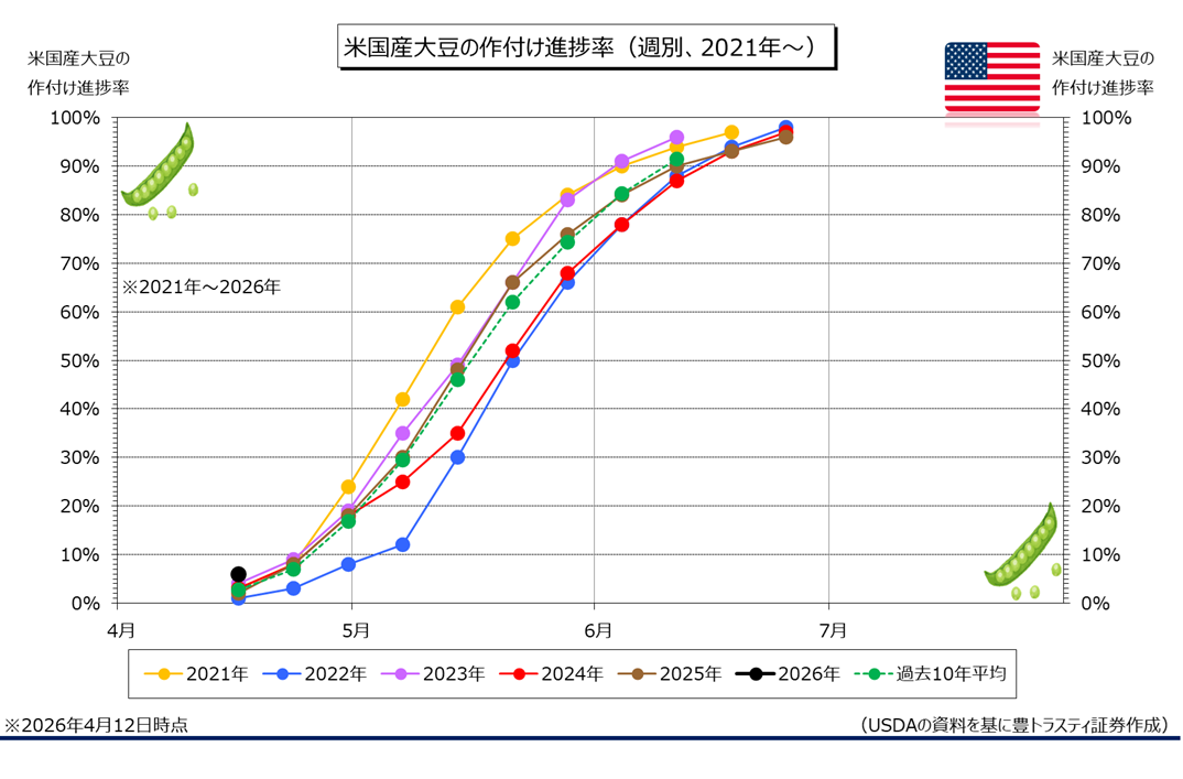 今年初めて公表された米国産大豆の「作付進捗率」は6%で、前年同期(2%)、過去5年平均(2%)を上回ってスタートしております。