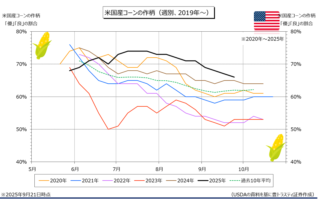 米農務省(USDA)が発表したクロップ・プログレス(9月21日時点)によると、米国産コーンの「作柄状況」は、優良と良好の合計が66%で、前週から1ポイント悪化しております(前年同期は65%)。