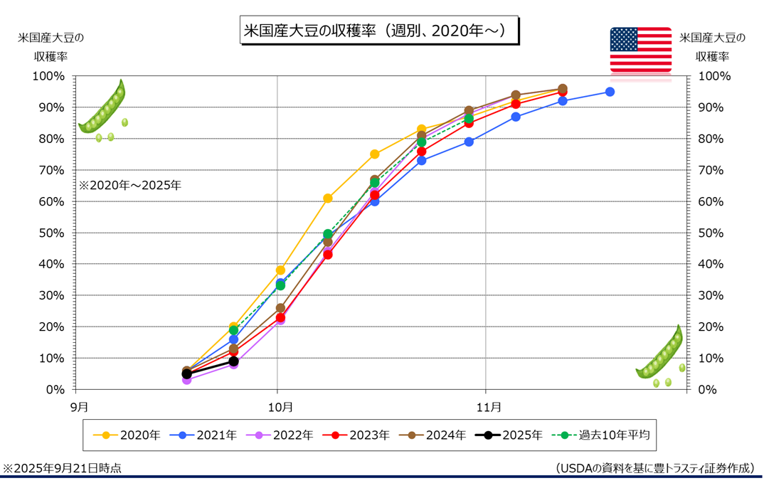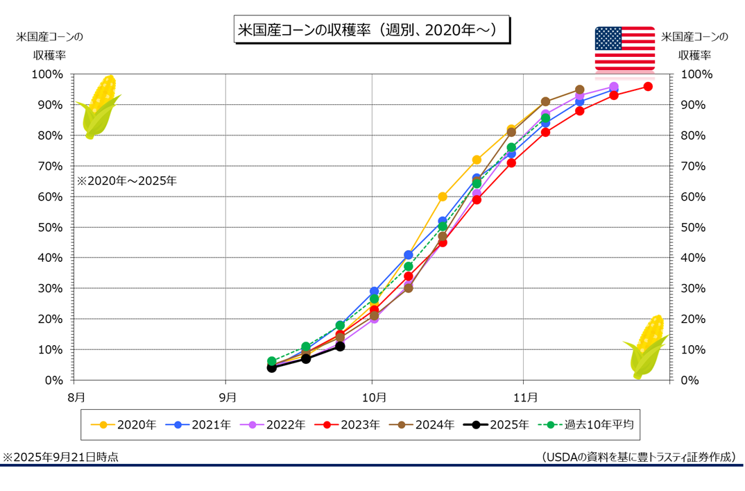 「デント率」は前週比6ポイント上昇の91%(過去5年平均は93%、前年同期は91%)、「完熟率」は同15ポイント上昇の56%(過去5年平均は59%、前年同期は59%)、「収穫率」は同4ポイント上昇の11%でした(過去5年平均は11%、前年同期は13%)。
