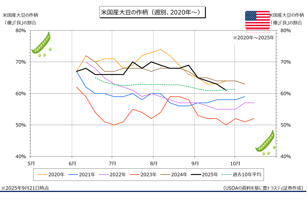 米国産大豆の「作柄状況」は、優良と良好の合計が61%で、前週比2ポイント悪化しました(前年同期は64%)。