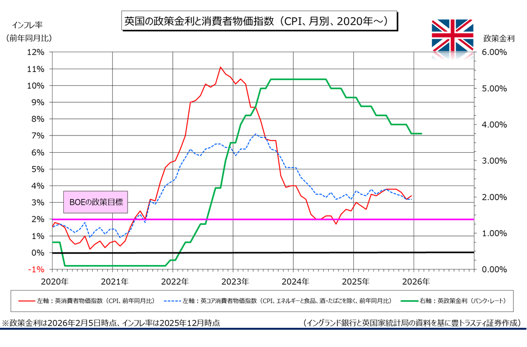 英イングランド銀行(中央銀行)は2月5日に、政策金利を3.75%で据え置くと発表しました。据え置きは2会合ぶり。物価上昇の鈍化が継続する中、賃金や価格設定への影響をさらに見極める必要があると判断した模様。一方で、さらなる利下げの可能性にも言及しております。据え置き決定は9人の政策委員のうち5人が賛成。残りの4人は、現在の金融政策は過度に引き締め的だとして0.25%の利下げを主張し、据え置きに反対しております。