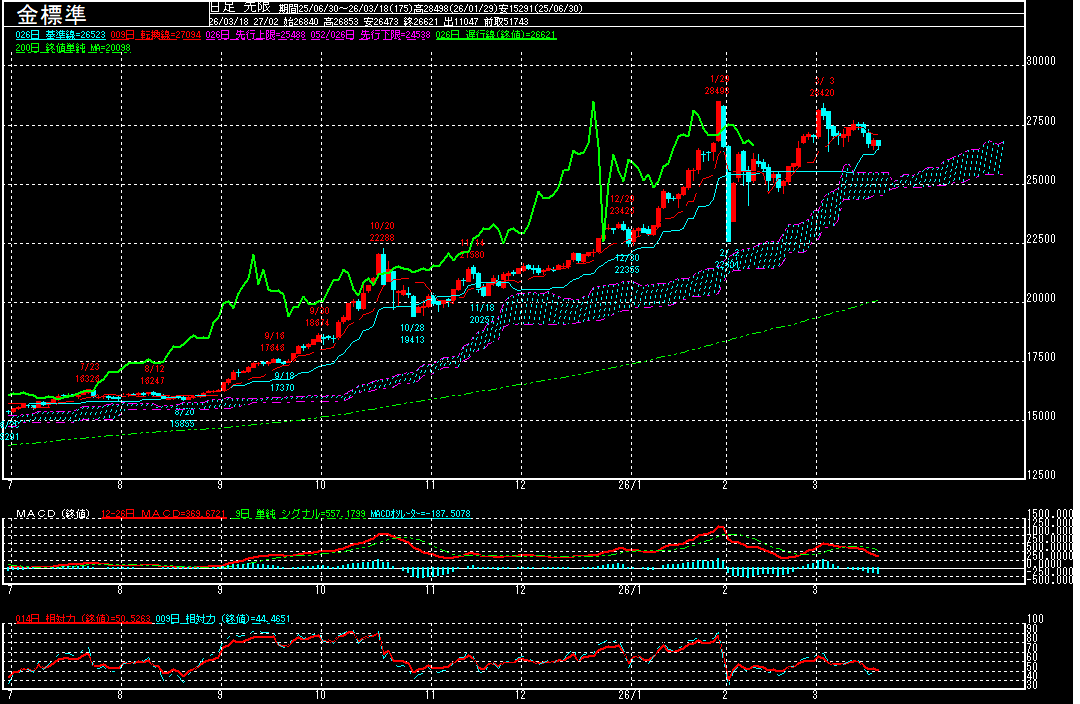26500円付近では買い拾われているように見えますが、FOMC声明がタカ派な内容となるようだと、MACDは下げ基調を強めるだけに、2月2日の安値22601円から3月3日の高値28420円の上げ幅をフィボナッチ・リトレースメントで見た場合の38.2%押し水準26197円辺りまで下げて来ることも想定されます。