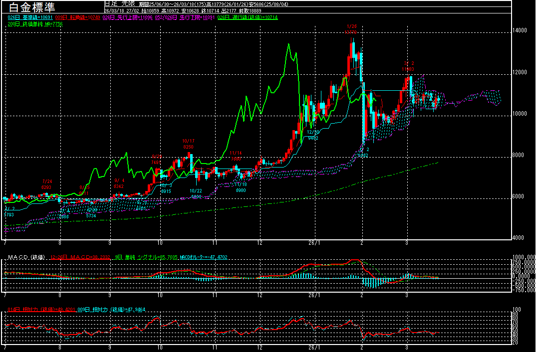 白金標準(期先)は前営業日比82円安の10632円で終了となり、反落。高値は10972円に留まり、節目の11000円に届かなかったことから、改めて上値の重さが意識されたようです。引き続きMACDは揉み合いを示唆しているものの、一目均衡表は「雲の捻じれ」となるだけに、そろそろトレンドが発生する可能性がありそうです。