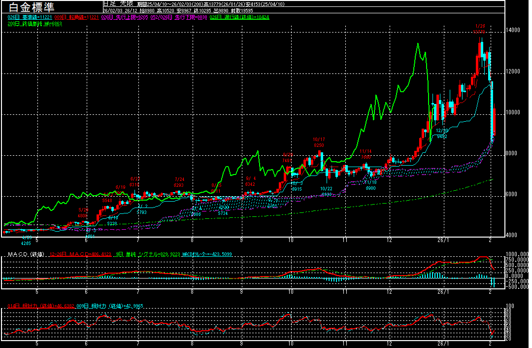 白金標準(期先)は前営業日比1628円高の10295円で終了となり、急反発。3営業日ぶりに反発に転じております。一目均衡表の雲がサポート・ラインとして意識されて安値は買い拾われる中、相関性の強い金相場の急反発につれ高となっております。「サーキットブレーカー」を発動させる中、一時10520円まで上昇する場面も見られるなど、10000円台を回復しております。