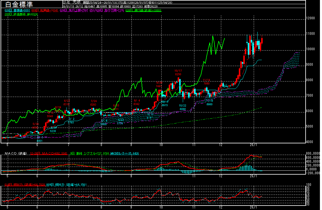 白金標準(期先)は前営業日比297円高の10803円で終了となり、大幅続伸。高値は10995円に留まり、11000円を回復することは出来ず。再度円安基調が強まっていることに加えて、相関性の強い金相場の上昇が続く中、1月7日の高値11200円を上抜いて、最高値を更新出来るか注目されます。