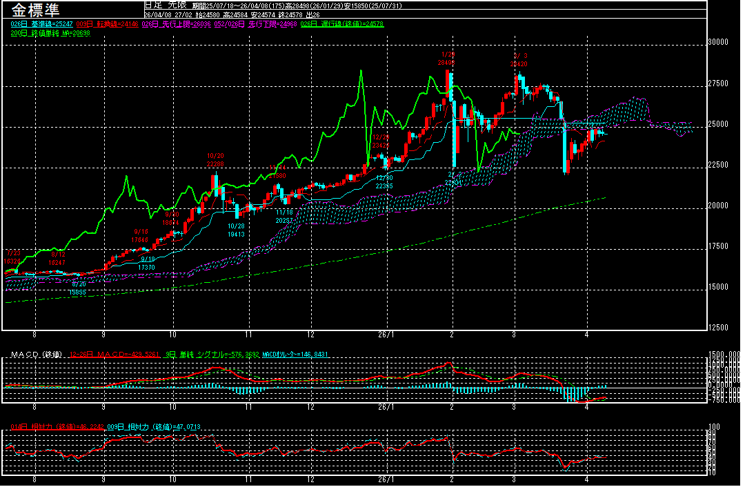 一目均衡表の雲がレジスタンスとして意識される中、高値は24871円に留まり、本日も25000円台に乗せることは出来ず。