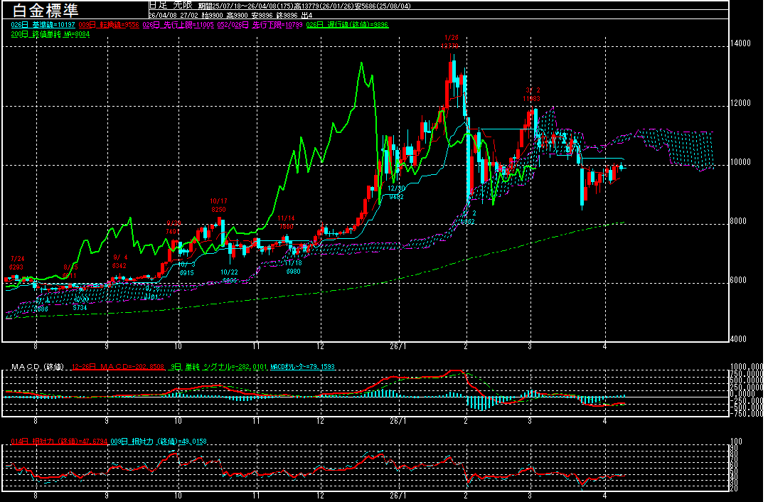 金と同じく、米国とイランの停戦交渉期限とされる日本時間4月8日午前9時を前に、様子見ムードが強かったように見えますが、ミニ・ペナントを形成する中、引き続き終値で10000円台に乗せることが出来るか注目されます。