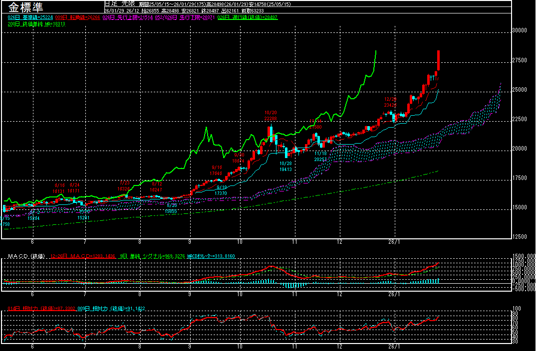 金標準(期先)は前営業日比1752円高の28497円で終了となり、3営業日続伸。