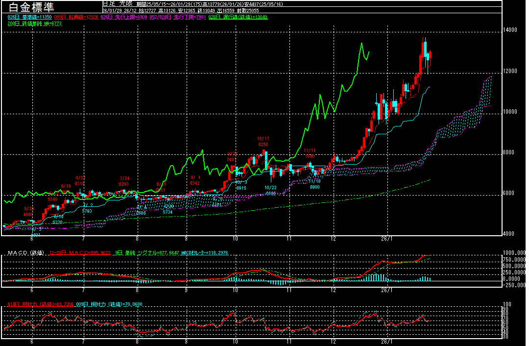 相関性の強い金相場が急伸する中、相対的な割安感が意識されたようです。13126円まで上昇する場面も見られております。
