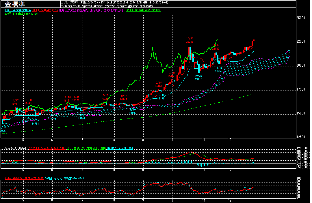 金標準(期先)は前営業日比162円高の22852円で終了となり、5営業日続伸。前日の高値22690円を上抜いて、一時22991円まで上昇するなど、連日で最高値を更新しております。