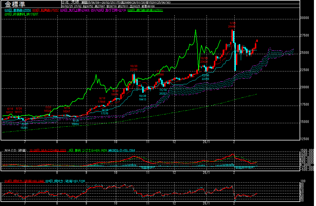 金標準(期先)は前営業日比488円高の27011円で終了となり、5営業日続伸。前日の高値26822円を上抜いて、一時27087円まで上昇する場面も見られるなど、1月29日以来の27000円台を回復しております。