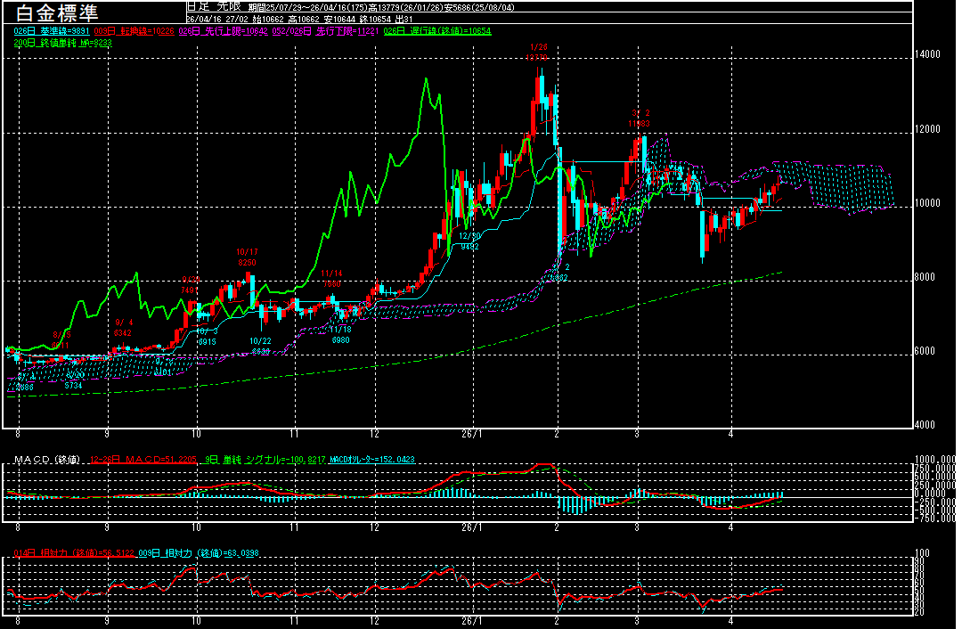 白金標準(期先)は前営業日比67円高の10622円で終了となり、続伸。