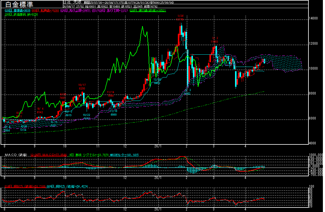 一方で、MACDの上昇が一服する中、雲でレジスタンスを受けるようですと、再度10000円辺りまで下げる可能性がありそうです。