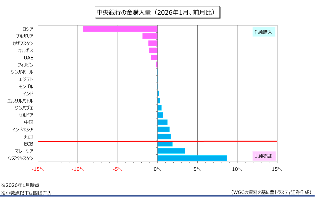 欧州では、ポーランド4ヶ月ぶりに増減がありませんでした。チェコは同1.7トン増と、35ヶ月連続で増加。セルビアは同0.7トン増と9ヶ月連続で増加。キルギスは同1.1トン減と、5ヶ月ぶりに減少。また、ブルガリアが2026年1月1日からEU共通通貨ユーロを導入し、21番目のユーロ圏加盟国となったことを受けて欧州中銀(ECB)に金準備を移管したことから、ECBは同1.9トン増、ブルガリアは同1.9トン減となっております。