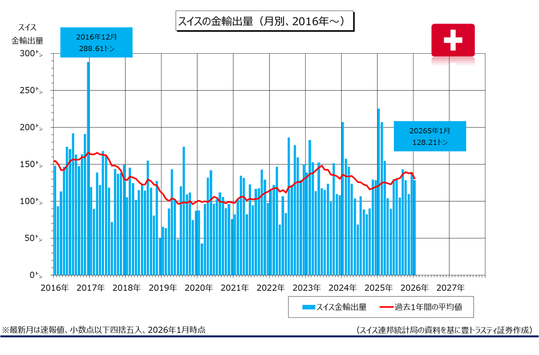 スイス連邦統計局によると、1月スイス金輸出量(速報値)は前年同月比43.1%減少の128.21トンでした。前月(138.98トン)も下回り、昨年11月(109.52トン)以来2ヶ月ぶり低水準に留まっております。32ヶ国に輸出され、最も多かった国は英国となっております。2位はインド、3位は中国、4位はフランス、5位はトルコでした。
