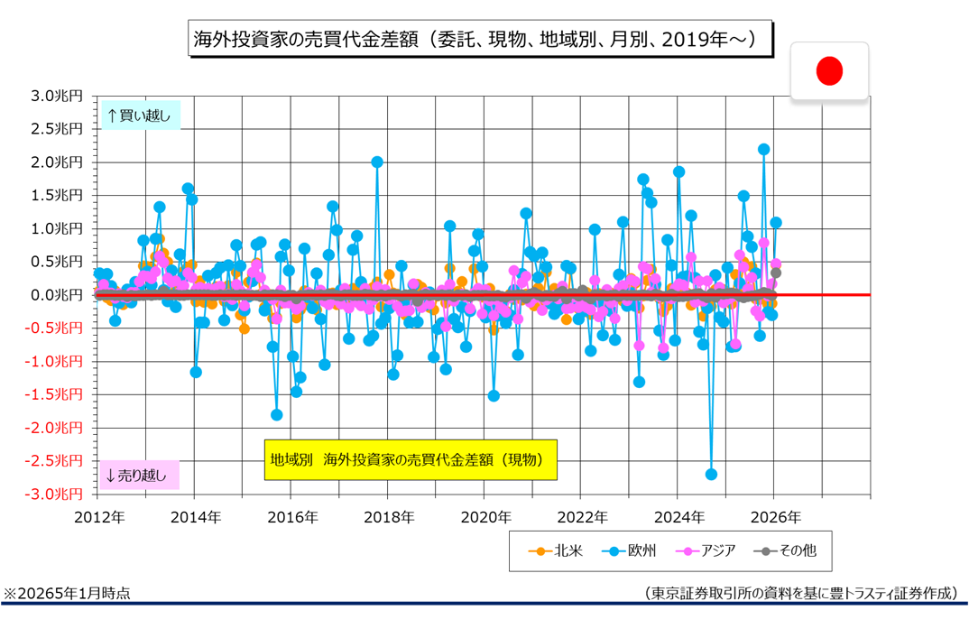 欧州勢は1兆0910億円の買い越しと、買い越し額は昨年10月(2兆1936億円の買い越し)以来の高水準となっております。買い越しは3ヶ月ぶり。欧州の売買動向は年金基金や中東からのオイルマネーなどの動きが反映され易いと言われます。また、アジア勢は4734億円の買い越しと、2ヶ月連続で買い越し。その他地域は3325億円の買い越しとなっております。