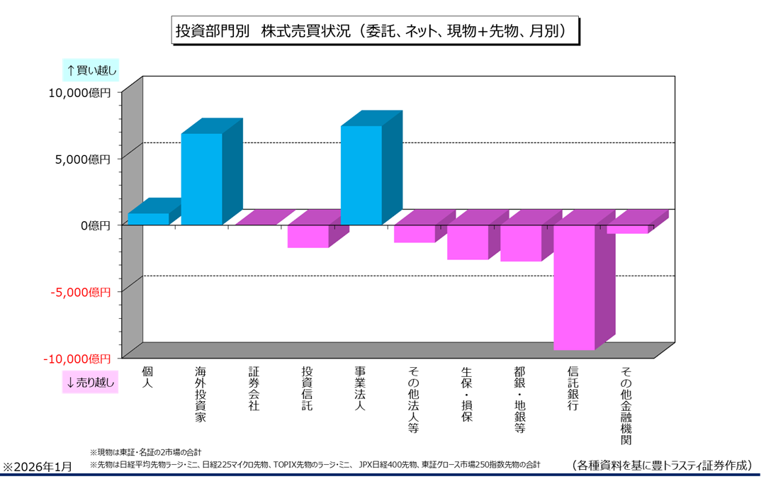 日本取引所グループ(JPX)が発表した1月投資部門別株式売買動向(現物株と先物合計)によると、海外投資家は6865億円の買い越しと、4ヶ月連続で買い越しました。現物は2兆3571億円の買い越しと、3ヶ月ぶりに買い越した一方、先物は1兆6705億円の売り越しと、3ヶ月ぶりに売り越しております。