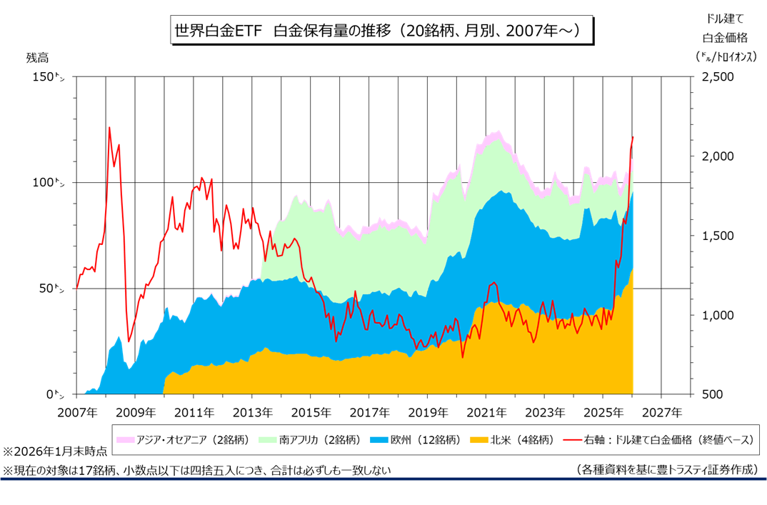 世界の白金ETF(月別、地域別)