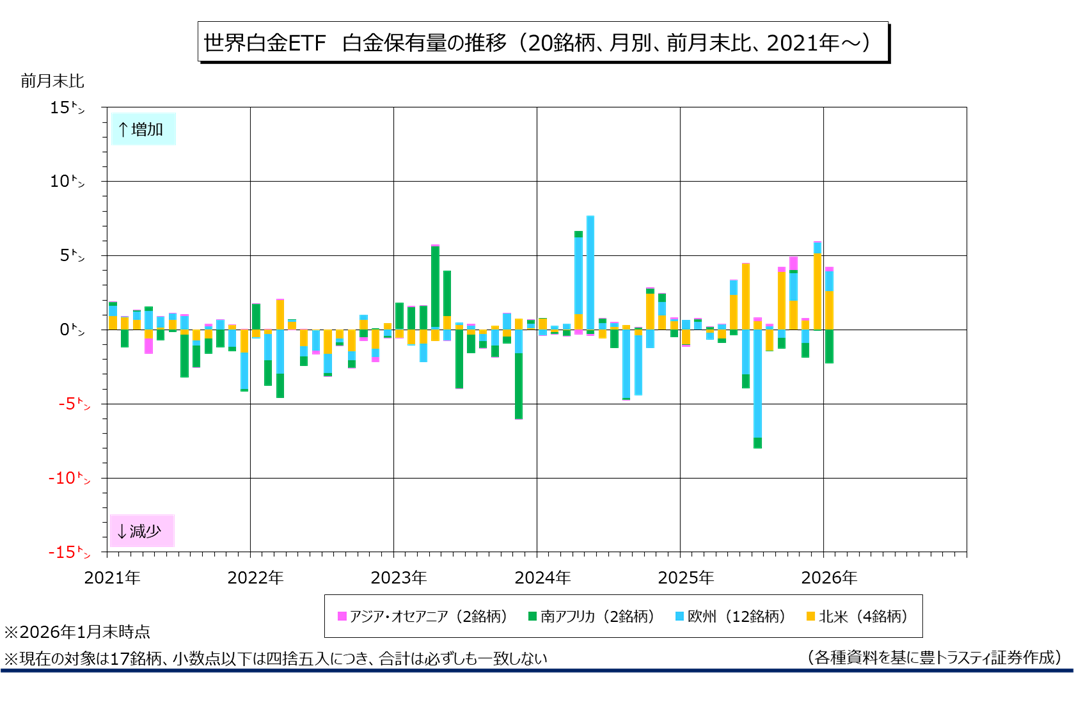 世界の白金ETF(月別、前月末比、地域別)