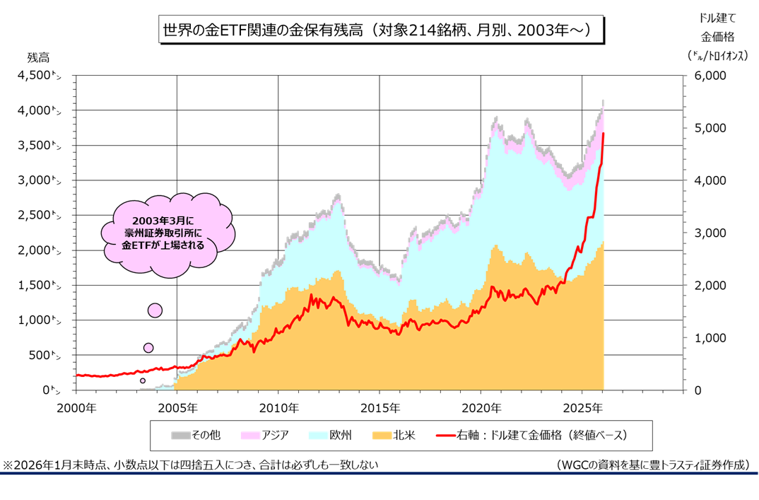 産金業界団体ワールド・ゴールド・カウンシル(WGC)が2月5日に公表した「Gold-Backed ETF FLOWS」によると、2026年1月末の世界の金ETF(上場投資信託)関連(214銘柄)の金保有残高は前月末比120.10トン増加の4144.58トンと、8ヶ月連続で増加。月末の残高としては、前月に続いて過去最高を更新しております。また、世界の金ETF関連の運用資産残高は前月末比1099.41億ドル増加の6686.70億ドルでした。8ヶ月連続で増加となり、過去最高を更新しております。