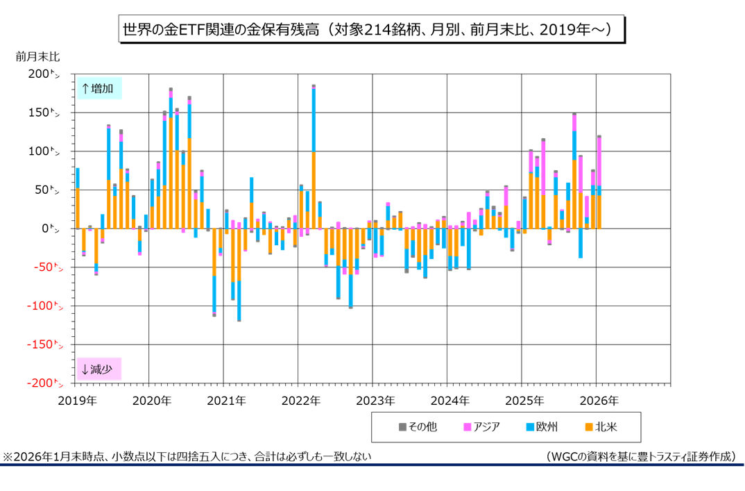 なお、銘柄別で見てみると、調査対象の214銘柄のうち、2026年1月は122銘柄が前月末から増加し、51銘柄が減少、41銘柄は変わらずでした。最も増加したのは「SPDR Gold Shares(米国)」で前月末比16.56トン増加。一方で、最も減少したのは「WisdomTree Physical Swiss Gold(英国)」で同1.47トン減少。