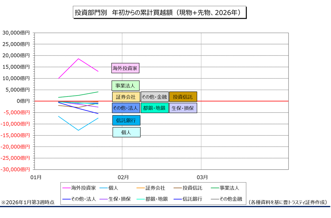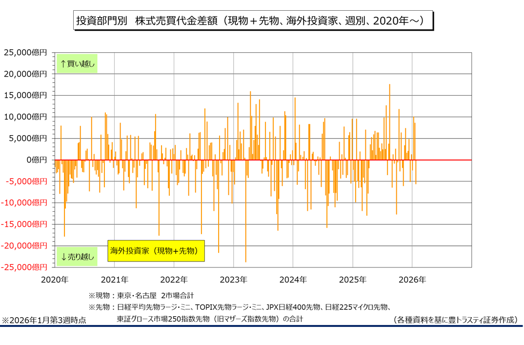 日本取引所グループ(JPX)のデータによると、1月第3週(1月19日~1月23日)の海外投資家による日本の現物株と先物合計の売買は5569億円の売り越しと、3週ぶりに売り越しに転じました。年初からの累計は1兆3060億円の買い越し。現物は1921億円の買い越しと、3週連続で買い越した一方、先物は7490億円の売り越しと、売り越しに転じました。