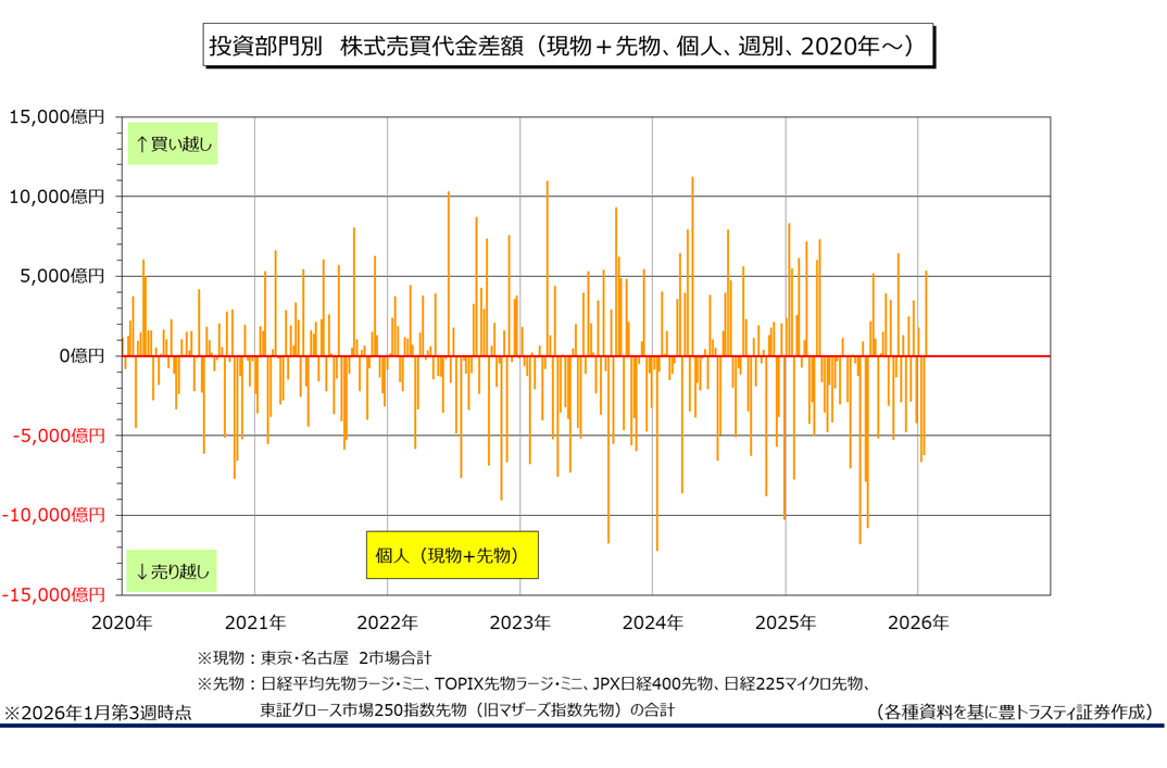 個人は5332億円の買い越しと、3週ぶりに買い越しております。買い越し額は昨年11月第1週(6412億円の買い越し)以来の大きさ。年初からの累計は7459億円の売り越し。現物は4792億円の買い越しと、3週ぶりに買い越しました。買い越し額は昨年11月第1週(5557億円の買い越し)以来の大きさとなっております。先物は540億円の買い越しと、2週連続で買い越し。