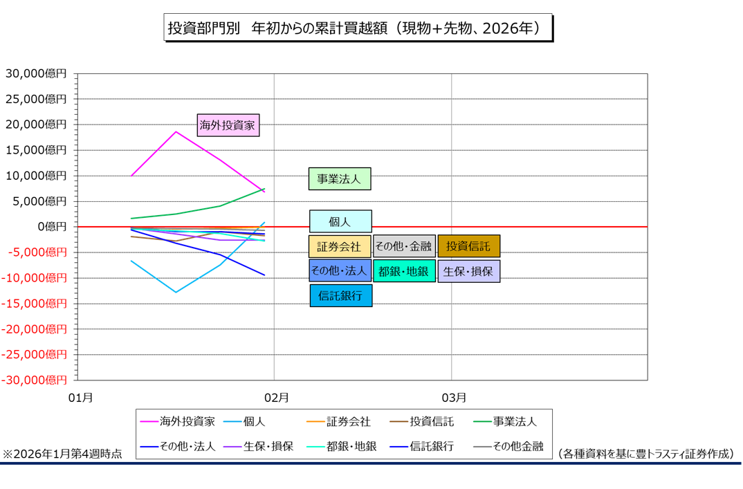 日本取引所グループ(JPX)のデータによると、1月第4週(1月26日~1月30日)の海外投資家による日本の現物株と先物合計の売買は6194億円の売り越しと、2週連続で売り越しました。売り越し額は昨年9月第4週(1兆2617億円の売り越し)以来の大きさとなっております。年初からの累計は6865億円の買い越し。