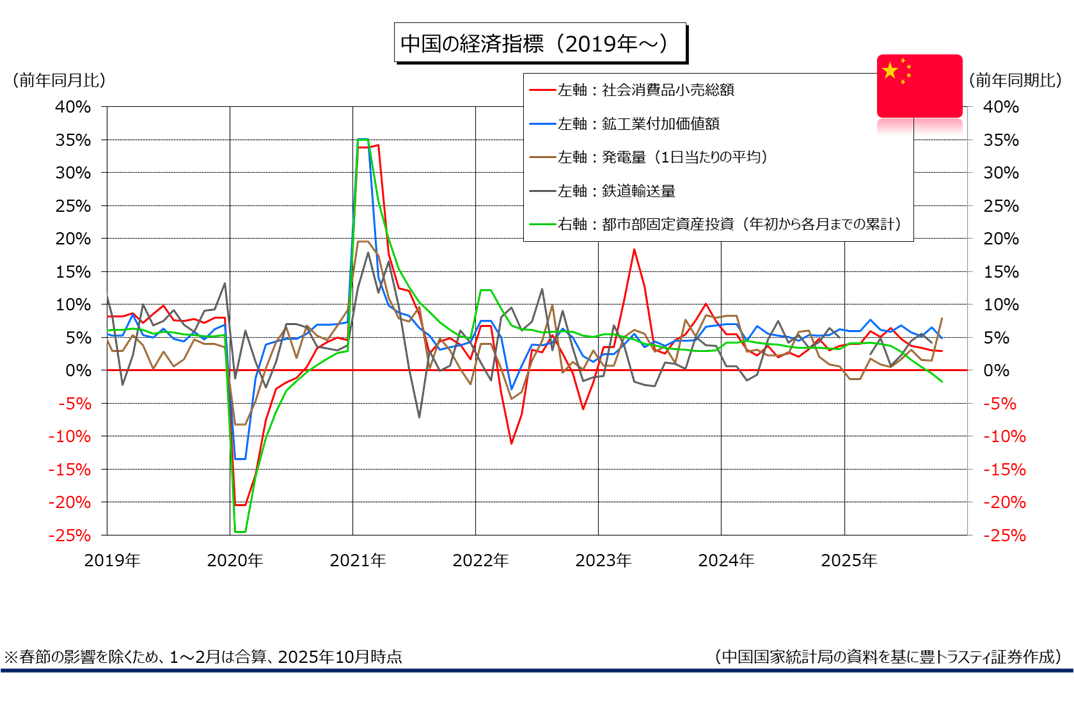 幅広い投資動向を示す2025年1-10月期中国都市部固定資産投資は前年同期比1.7%減と、1-9月期(同0.5%増)から鈍化。2ヶ月連続でマイナスとなっております。政府が景気の下支え役と位置づけるインフラ投資は同0.1%増(1-9月期は同1.1%増)、民間企業の投資は同4.5%減だった(1-9月期は同3.1%減)。製造業の投資は同2.7%増(1-9月期は同4.0%増)。不動産販売額は同14.7%減だった(1-9月期は同13.9%減)。