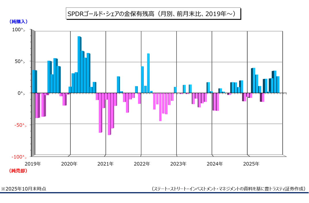 世界最大の金ETFである「SPDRゴールド・シェア」の10月末の金保有残高は前月末比26.31トン増加の1039.20トンと、5ヶ月連続で増加。