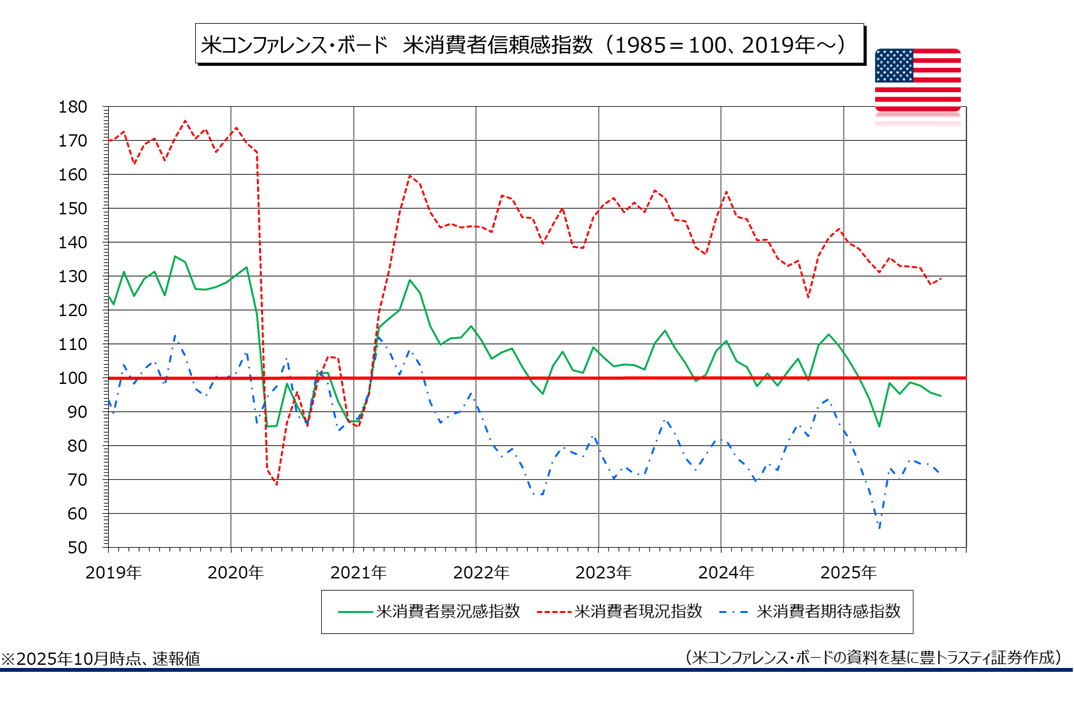 米民間有力調査機関コンファレンス・ボードが10月28日に発表した10月米消費者景気信頼感指数(1985年=100)は94.6と、前月(改定値、95.6)から低下。4月(85.7)以来6ヶ月ぶり低水準となっております。米消費者の間で、事業環境や労働市場への見通しに対する不安感が高まっている模様。ただ、市場予想(93.2)は上回りました。なお、現況指数は129.3(前月は127.5)、期待指数は71.5(前月は74.4)となっております。