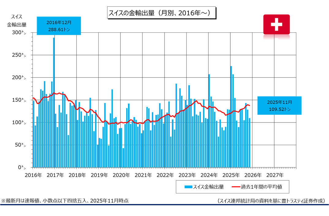 スイス連邦統計局によると、11月スイス金輸出量(速報値)は前年同月比15.2%減少の109.52トンと、6ヶ月ぶりにマイナスに転じました。前月(128.18トン)も下回り、8月(104.71トン)以来3ヶ月ぶり低水準となっております。2025年1-11月期累計では前年同期比17.0%増加の1525.26トン。