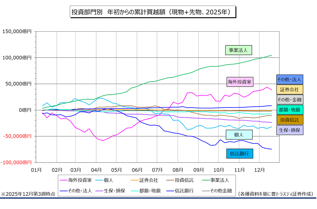 事業法人は2247億円の買い越しと、12週連続で買い越しております。年初からの累計は10兆4482億円の買い越し。