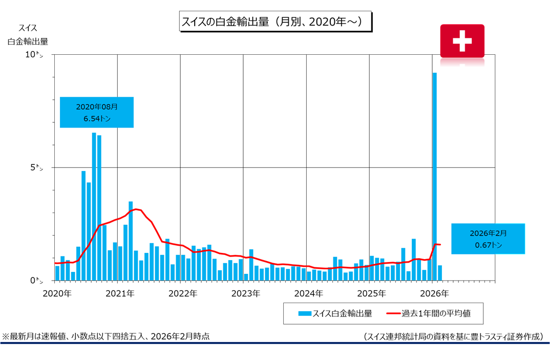 スイス連邦統計局によると、2月スイス白金輸出量(速報値)は前年同月比34.0%減少の0.67トンと、3ヶ月ぶりにマイナスに転じました。少なくとも2012年以降で最高となった前月(9.20トン)を下回り、昨年11月(0.46トン)以来3ヶ月ぶり低水準に留まっております。2026年1-2月期累計では前年同期から約4.7倍増の9.86トン。