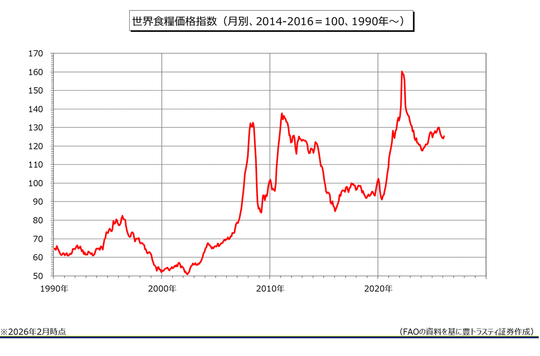 国連食糧機関(FAO)が3月6日に発表した2月世界食糧価格指数は前月比1.1ポイント上昇の平均125.3と、6ヶ月ぶりに上昇に転じました。乳製品と砂糖が下落したものの、穀物、肉類、大半の植物油が上昇。前年同月比では1.0%低下と、5ヶ月連続で低下しております。