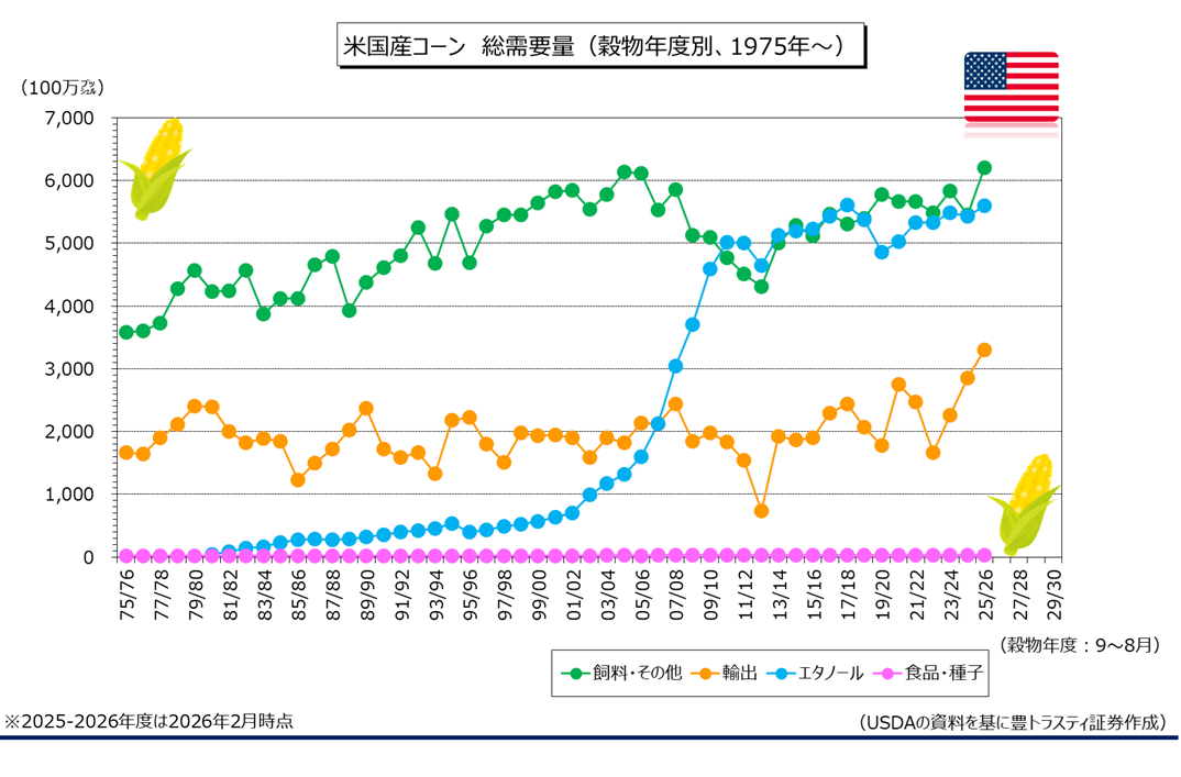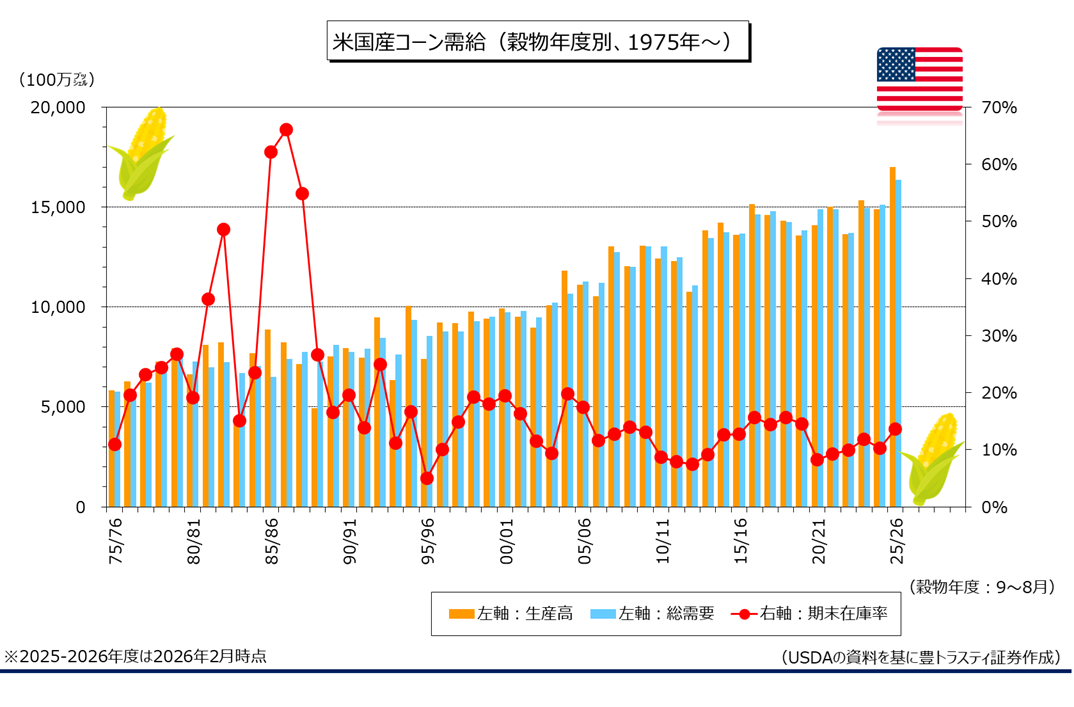 米農務省(USDA)は2月10日に発表した2月農産物需給報告で、新穀となる2025-2026年度米国産コーンの期末在庫を21億2700万ブッシェルと、前月見通し(22億2700万ブッシェル)から下方修正。市場予想平均(22億2700万ブッシェル)も下回りました。ただ、実現すれば2018-2019年度以来の高水準となります。