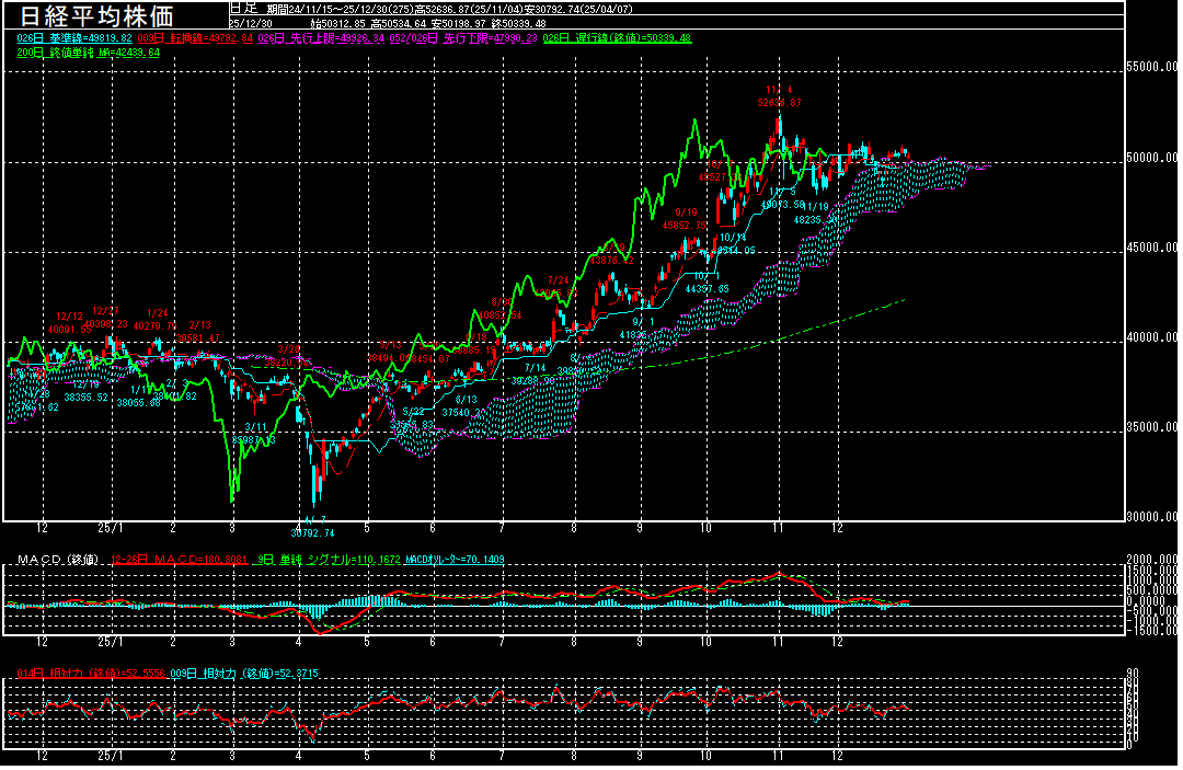 テクニカル的な買われ過ぎ感が強まったことに加えて、人工知能(AI)関連株を中心にハイテク株の割高感が意識され始める中、ここまで相場を牽引してきたソフトバンクグループ(SBG)などAIや半導体関連株を中心に売りが拡がり、50000円を割り込む場面も見られるも、株価急騰に乗り遅れた投資家の押し目買いや自社株買いが株価を下支える中、2025年は50339.48円で終了。