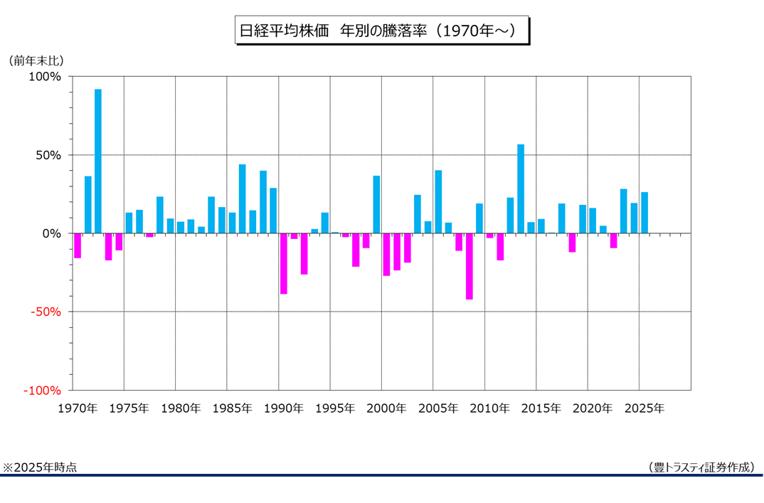 2025年の日経平均株価は前年末比26.2%上昇。3年連続で上昇となり、史上初めて5万円を突破するなど、歴史的な株高となりました。