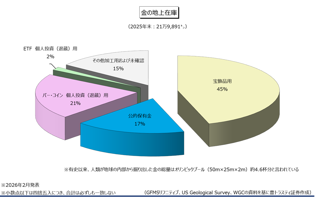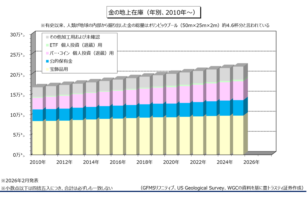 産金業界団体ワールド・ゴールド・カウンシル(WGC)の統計によると、2025年末の金地上在庫は前年比1.7%増加の21万9891トンと推定されました。白金やパラジウムと違い、金の生産国は世界各地にあり、産金量はほぼ安定していることから、地上在庫も安定して推移しております。